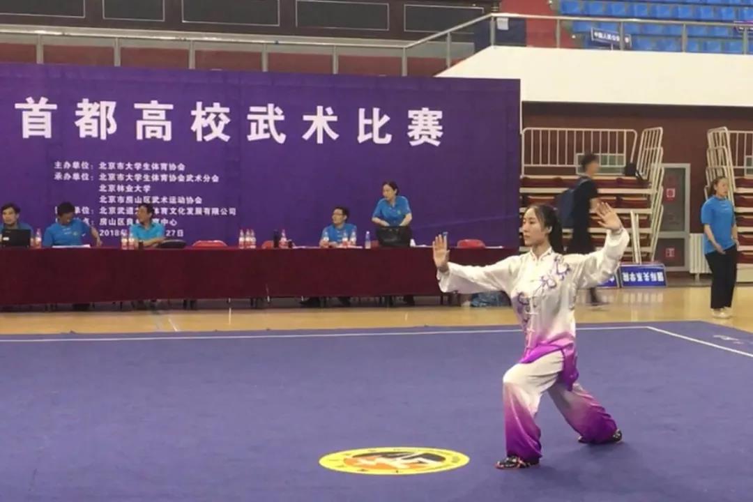 2014级本科生田青青在本次比赛中获得女子传统双器械冠军,女子吴式太极拳冠军,女子陈氏太极拳第五名。
