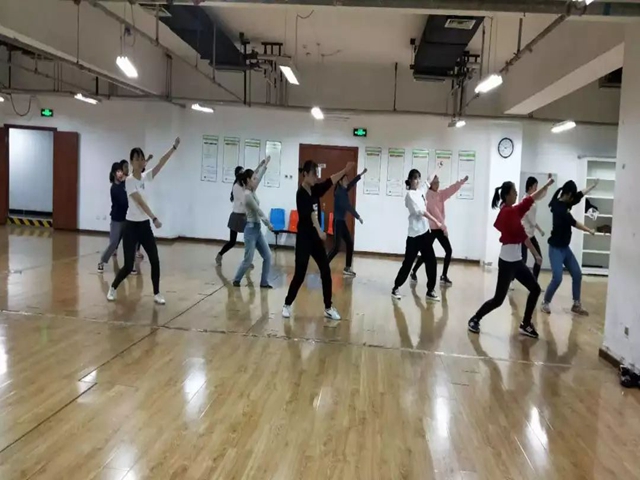 “台上一分钟,台下十年功”,在赛前的一个半月紧张排练中,图书馆地下室、学服405、行政楼前空地、篮球场,到处都可以看到啦啦操队排练的身影,队员们克服种种困难,投入到紧张排练中,密集的力量训练、动作练习、队形练习,队形、舞步、音乐反复磨合,队员们相互鼓励、相互帮助,高标准完成一次次排练,从未轻言放弃。