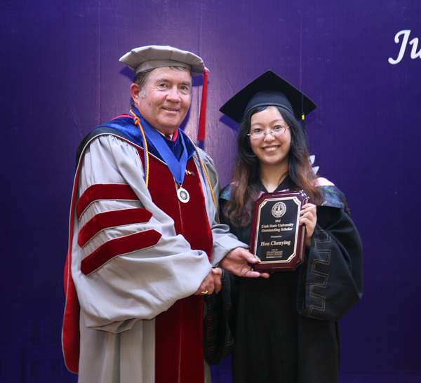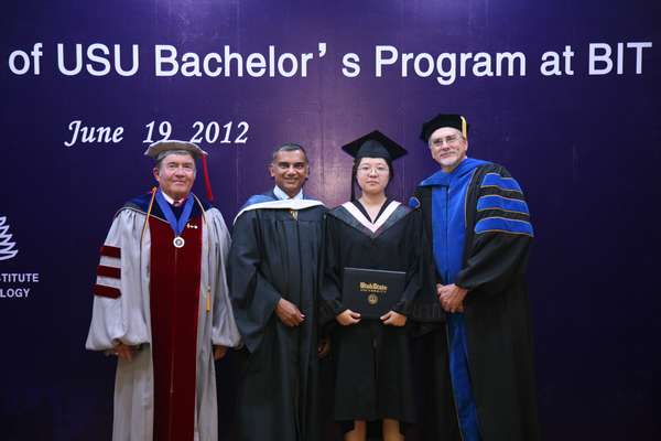 犹他州立大学中国项目副主任赖超群博士首先宣读了毕业生名单,商学院助理院长Dave Patella博士给全体毕业生一一颁发了犹他州立大学理学士学位证书并合影留念。Dwight Israelsen教授代表犹他州立大学商学院授予侯琛颖同学2012年度杰出毕业生称号,并颁发杰出毕业生奖牌。