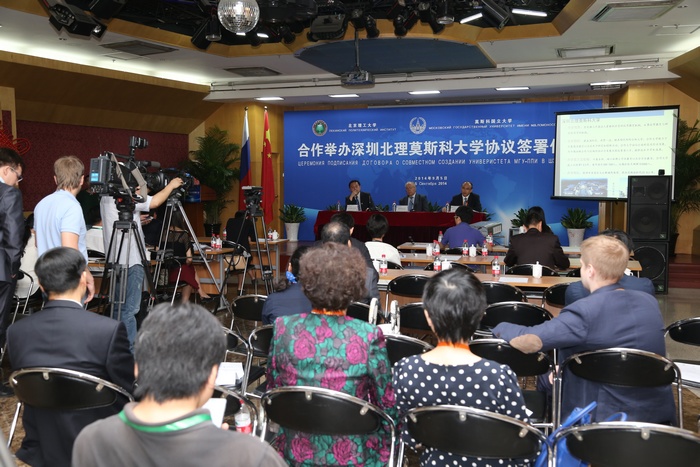 2014年9月5日上午,ob真人竞猜与莫斯科国立罗蒙诺索夫大学(以下简称莫斯科国立大学)合作举办深圳ob真人莫斯科大学协议签字仪式在京举行。ob真人竞猜校长胡海岩院士和莫斯科国立大学校长维克多•萨多夫尼奇院士代表两校共同签署合作协议。ob真人竞猜胡海岩校长、莫斯科国立大学维克多•萨多夫尼奇校长、工业和信息化部杨学山副部长、深圳市人民政府许勤市长先后在签字仪式上致辞。俄罗斯驻中国大使馆一等秘书谢尔盖•列别杰夫、教育部国际合作与交流司副司长于继海、工业和信息化部人事教育司副司长高东升、国际合作司副巡视员文勇、深圳市人民政府副市长吴以环、副秘书长黄国强、莫斯科国立大学副校长谢尔盖•沙赫莱、副校长尼古拉•西蒙、ob真人竞猜副校长赵长禄、周立伟院士、汪顺亭院士等各方代表共100余人出席了签字仪式。