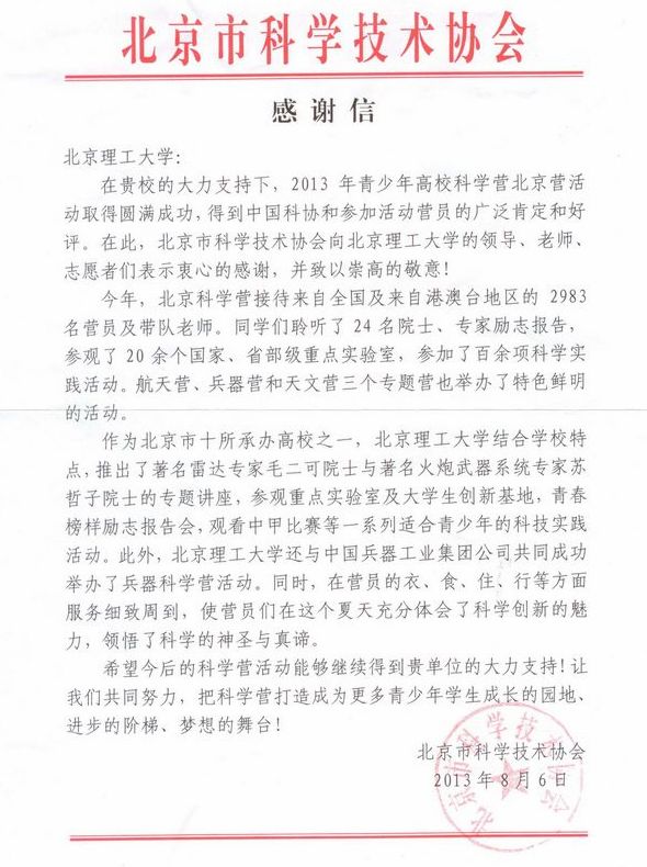 2013年暑期,ob真人徐特立科学营在学校办公室的组织协调下,在校团委、后勤集团等单位大力支持下,经信息与电子学院团委周到细致的工作,取得了圆满成功。作为青少年高校科学营北京营的主办单位,北京市科学技术协会特向我校发来感谢信。