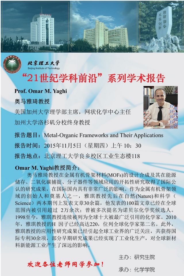 【化学学院】“21世纪学科前沿”Omar M. Yaghi教授学术报告通知