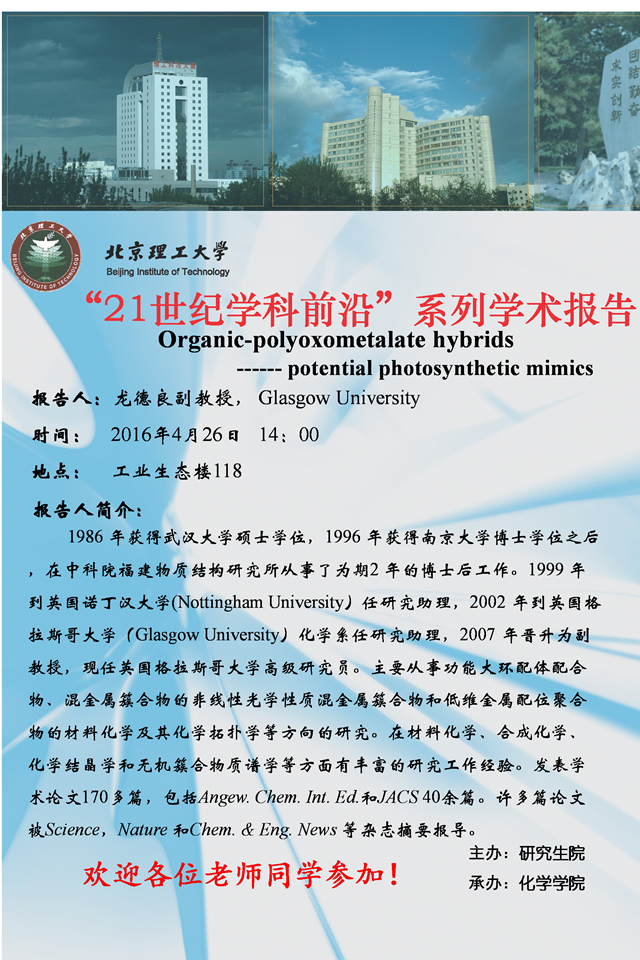 【化学学院】“21世纪学科前沿”龙德良学术报告通知