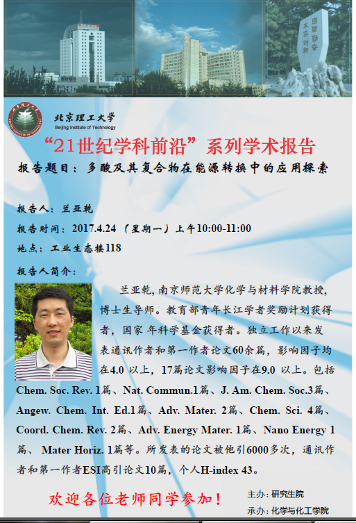【化学与化工学院】“21世纪学科前沿”兰亚乾教授学术报告通知