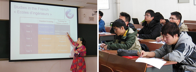此外,图尔大学工程师学院、奥尔良大学工程师学院分别详细反馈了我校历届学生在法国的学习情况,项目运行良好。我校自2008年开展了本项目,先后有68名同学参加项目,2013年9月将有11名同学赴法学习。当天下午1:00,图尔大学工程师学院的老师为我校学生介绍了赴法访学及读研项目,以及图尔大学工程师学院和奥尔良大学工程师学院的相关情况,并回答同学们的问题。