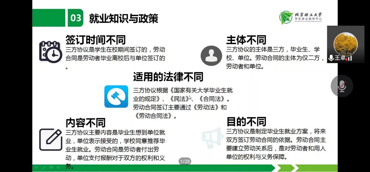 会中,王卓老师为同学们介绍了多种政策性就业渠道:如西部志愿者、部队文职、国防系统、驻外志愿者、赴外志愿者和国际组织就业等,说明了就业协议书的签订过程及签订原则,最后留下了学生就业指导中心的联系方式等信息。