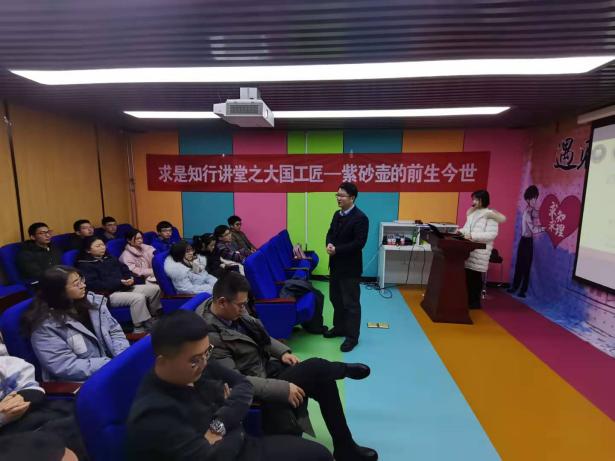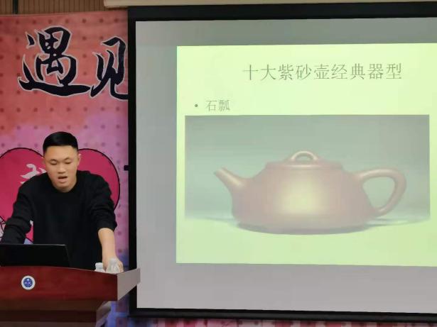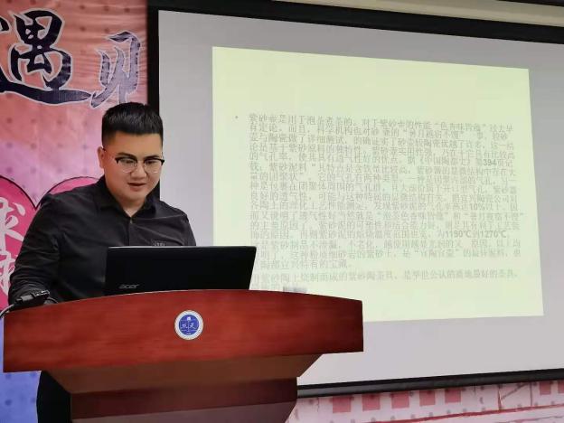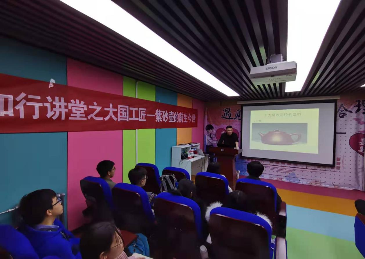 吴宇翔先生生动的为我们介绍了十大紫砂壶经典器型,紫砂壶那美轮美奂的造型加上吴宇翔先生的讲述,到场的求是书生都听的如痴如醉。潘登先生以紫砂壶起源历史开始,为我们开启了一段与紫砂壶为伴的奇妙之旅,每个人都被紫砂壶精美的外表和浓厚的历史底蕴所深深吸引。在欣赏紫砂壶的同时,两位老师还为我们补充了紫砂壶的制作材料、工艺等一系列知识,在学习紫砂壶深厚文化的同时还与我们的专业知识产生联系。两位紫砂壶大师的讲述引发了同学们强烈的共鸣,同学们在讲座结束后还提出来一些有关紫砂壶以及紫砂泥的问题,展现出对紫砂壶的浓厚兴趣,这也离不开两位先生的倾情讲述。