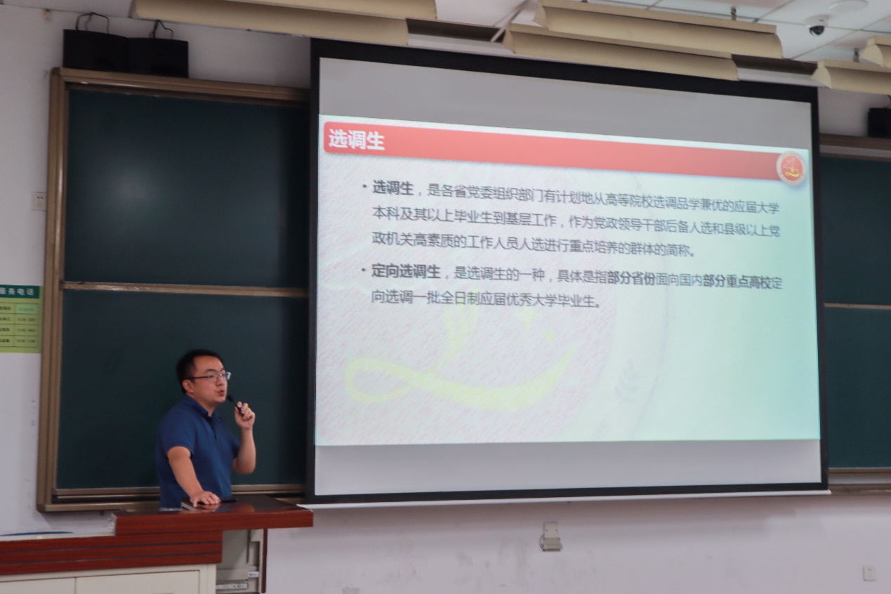 会中,张龙泽老师还将选调生、西部志愿者等相关政策性就业渠道介绍给同学们,并对就业有关的时间节点和注意事项进行解读。在学生交流提问环节,同学们针对自身需求如选调生相关政策、应届生住房补贴等各个方面积极提问,张泽龙老师为同学们一一进行解答,并希望同学们学会对自己负责,树立规则意识。