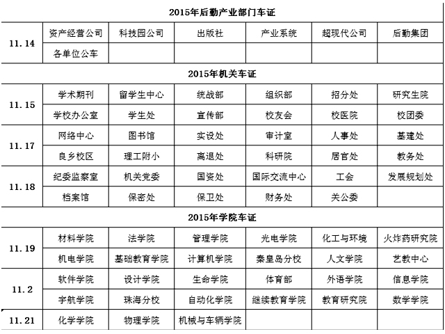 3、自11月14日起,各单位到校园停车管理办公室(菜市场北门对面)进行交费并领取2015年停车证。各单位领取车证时间安排如下:(详见附件)
