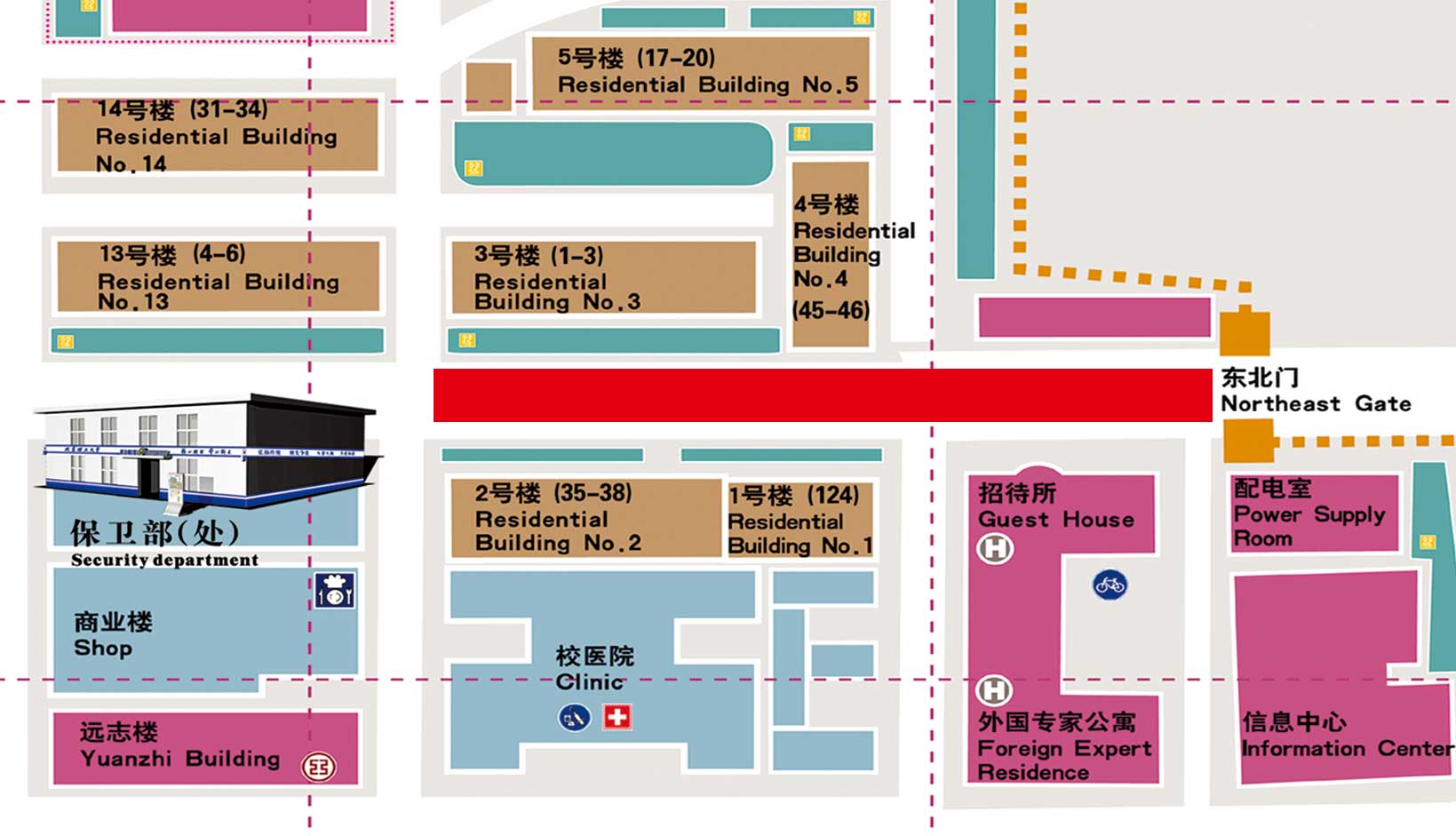 2015年9月9日至9月16日,中关村校区校园北路东段新建机电实验中心室外雨水管道将要进行施工,具体施工路段如图红色区域。由于校园北路是中关村校区北边重要的交通干道,此次破路施工将会影响车辆通行。为了保证施工期间的人员与车辆安全,同时也保障工程的有序进行。在施工期间,东北门大门关闭,机动车禁止通行,请绕行学校其他大门进出。请广大师生、车主提前规划好自己的行车路线。