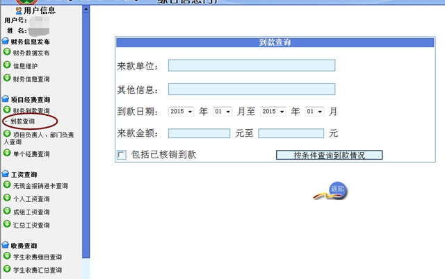3. 请在“来款单位”栏输入来款单位名称中连续的若干字或词,或在不连续的字或词之间加%。如:查询北京化工大学来款,可输入“化”、“化工”、“化工大”、“北京化工”、“北京%大学”、“北%学”等进行查询。若输入“北化工”则查询不到。