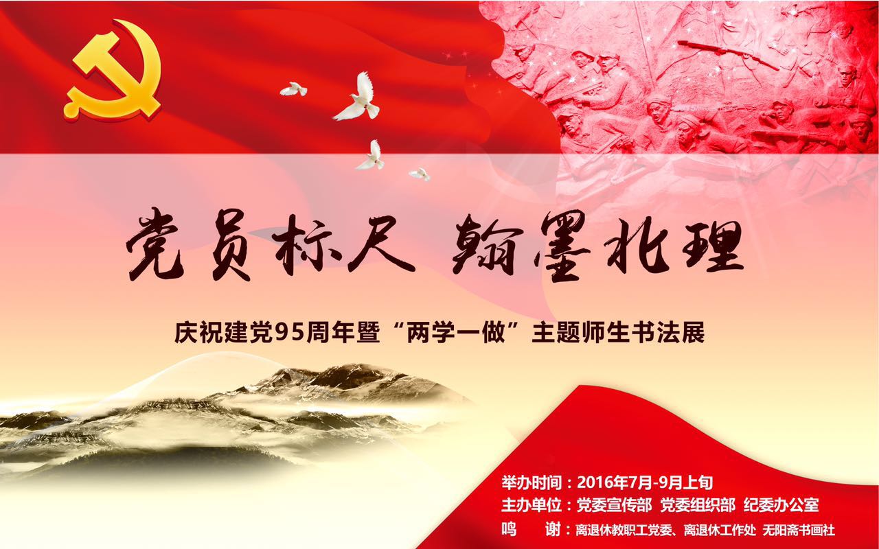 为纪念中国共产党成立95周年,深入扎实开展“两学一做”学习教育,校党委宣传部、党委组织部与纪委办公室将联合举办“党员标尺 翰墨ob真人——建党95周年暨‘两学一做’主题书法展”。本次展览得到了离退休教职工党委、离退休工作处以及无阳斋书画社的大力支持。