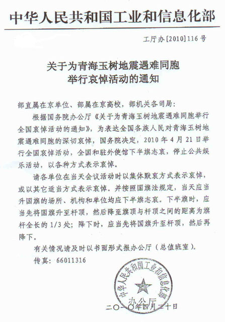 > 关于为青海玉树地震遇难同胞举行哀悼活动的通知