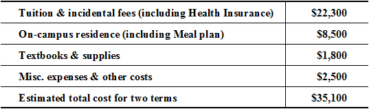 在加拿大滑铁卢大学学习期间的费用由学生自理。每学年(2个学期)的费用估计(加元)如下:
