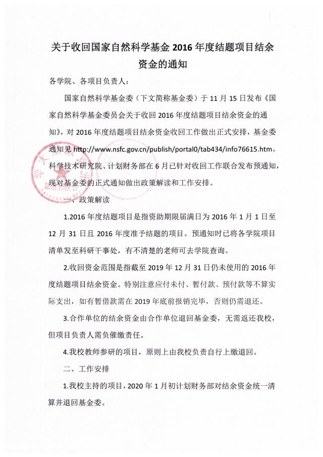 > 关于收回国家自然科学基金2016年度结题项目结余资金的通知