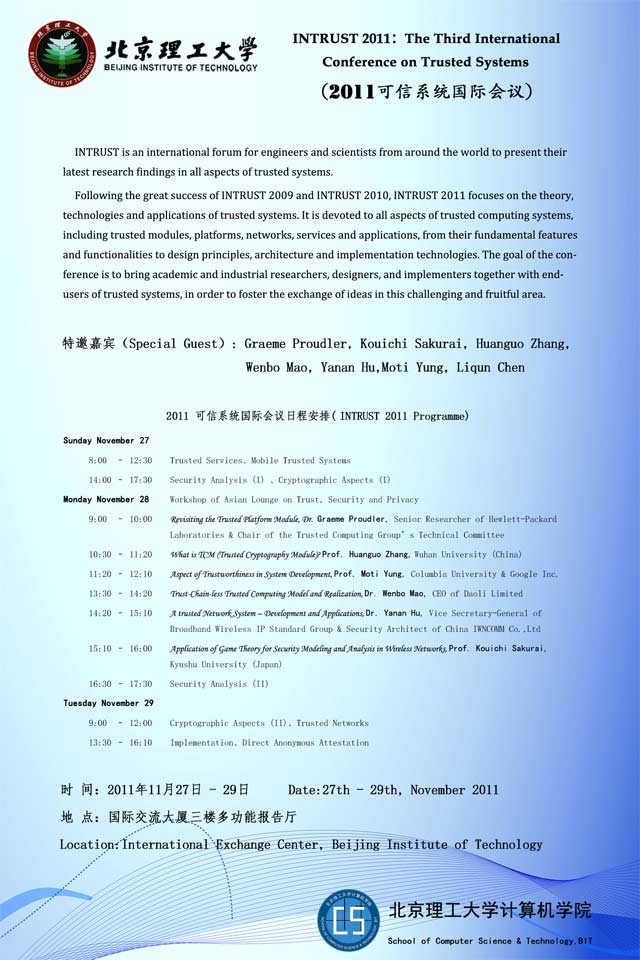 ob真人计算机学院主办并承办的第三届可信系统国际会议(INTRUST 2011)将于2011年11月27到29日在ob真人国际交流中心召开,会议录用22篇论文,并在28日邀请到了Graeme Proudler、Moti Yung、Kouichi Sakurai、毛文波、张焕国、Yanan Hu等6位际、国内顶级专家给大会做特邀报告,会议内容涉及可信计算、安全协议、云存储安全、无线安全等领域内容。邀请感兴趣的师生积极参与。