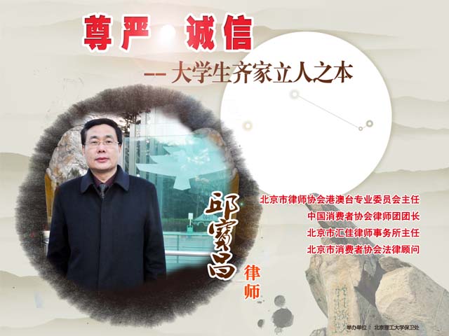 报告题目:尊严与诚信——大学生齐家立人之本 报告人:邱宝昌律师 时 间: 2011年12月22日晚19:00 地 点: 中心教学楼一层报告厅 报告人简介: 邱宝昌,北京市律师协会港澳台专业委员会主任;中国消费者协会律师团团长;北京市汇佳律师事务所主任;北京市消费者协会法律顾问。 特别备注:现场安排了抽奖环节,为同学们准备了120份精美、实用的纪念品。 欢迎师生踊跃参加!