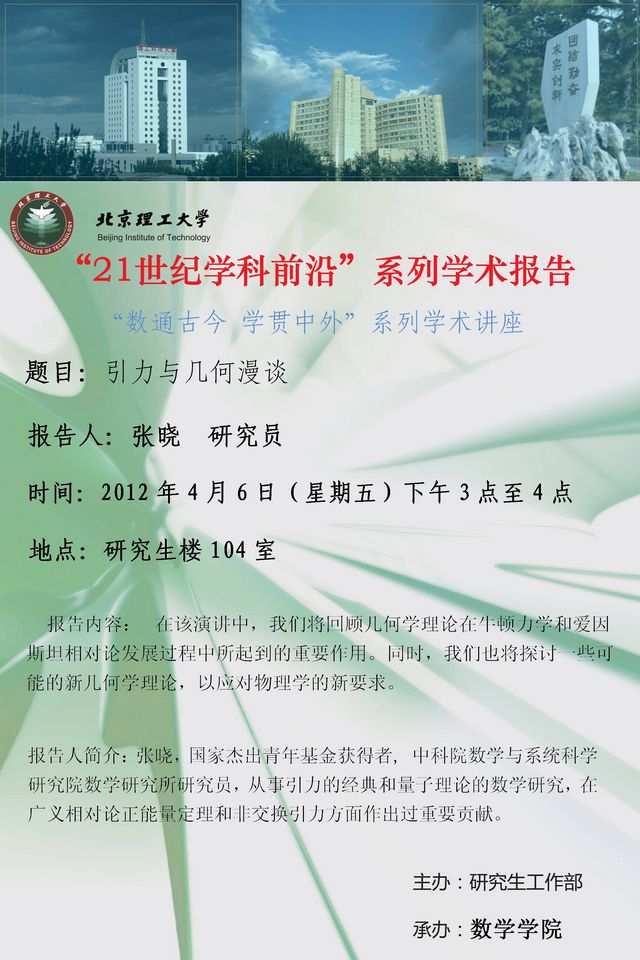 报告摘要:在该演讲中,我们将回顾几何学理论在牛顿力学和爱因斯坦相对论发展过程中所起到的重要作用。同时,我们也将探讨一些可能的新几何学理论,以应对物理学的新要求。