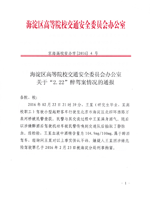 转发《海淀区高等院校交通安全委员会办公室关于“2.22”醉驾案情况的通报》