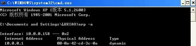 对于教学区用户来说,对应于本网段网关的合法物理地址(MAC地址)都应该为如图所示的00-0a-42-cd-3c-0a。如果显示不是这个MAC地址,那么就是本网段有机器中病毒了。可以记录下这个MAC地址,电话68914833报修,本中心会临时关闭这个MAC地址对应的网口,保证本网段的正常上网。