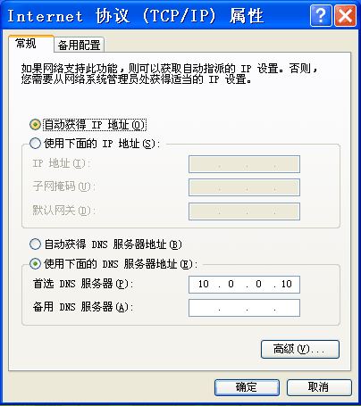5、“使用下面的DNS服务器”中“首选DNS服务器地址”仍然填写??10.0.0.10”。