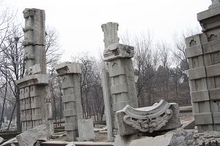 十二兽首展厅,各个兽首,虽然是仿制品,仍然显得那么的栩栩如生,遗落在海外的兔首和鼠首,期盼早点回归祖国。在绮春园、福海、长春园,随处可以看到断壁残垣,零落的还带着雕刻花纹的碎石块。鉴碧亭、残桥、风荷楼,也一样是残缺不全。昔日的“万园之园”,在寒冷的冬季更像是一座坟墓,它的雍容华贵早已在侵略者的炮火中消逝。这样的国耻,如何让人忘却?