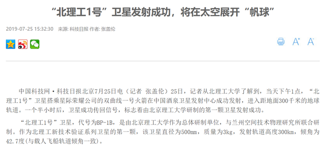 编辑:吴楠 审核:王征 阅读次数:原文标题:“ob真人竞猜1号”卫星发射成功,将在太空展开“帆球”