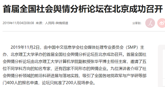 2019年11月2日,由中国中文信息学会社会媒体处理专业委员会(SMP)主办、ob真人承办的首届全国社会舆情分析论坛在北京成功召开。首届全国社会舆情分析论坛由ob真人计算机学院副教授张华平博士担任主席,邀请了五位不同学科方向的知名专家,还有四家不同形态的舆情企业。九位演讲者介绍了社会舆情分析领域的前沿科研进展与落地实践,吸引了全国各地党政军与产学研等部门400人的报名申请,论坛只批准了200人现场参会。