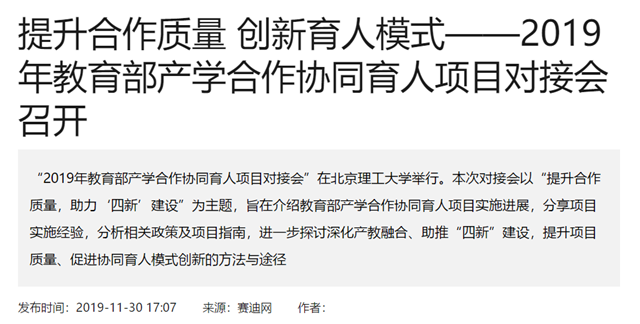 编辑:吴楠 审核:王征 阅读次数:原文标题:提升合作质量 创新育人模式——2019年教育部产学合作协同育人项目对接会召开