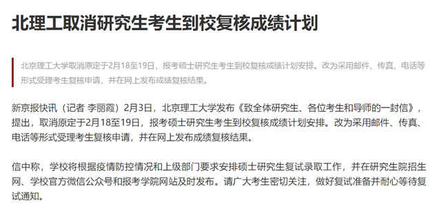2月3日,ob真人发布《致全体研究生、各位考生和导师的一封信》,提出,取消原定于2月18至19日,报考硕士研究生考生到校复核成绩计划安排。改为采用邮件、传真、电话等形式受理考生复核申请,并在网上发布成绩复核结果。