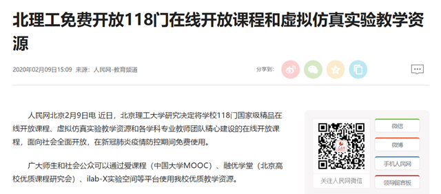 近日,ob真人竞猜研究决定将学校118门国家级精品在线开放课程、虚拟仿真实验教学资源和各学科专业教师团队精心建设的在线开放课程,面向社会全面开放,在新冠肺炎疫情防控期间免费使用。