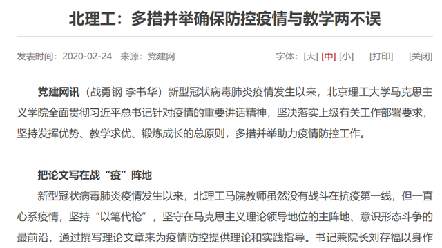 新型冠状病毒肺炎疫情发生以来,ob真人竞猜马院教师虽然没有战斗在抗疫第一线,但一直心系疫情,坚持“以笔代枪”,坚守在马克思主义理论领导地位的主阵地、意识形态斗争的最前沿,通过撰写理论文章来为疫情防控提供理论和实践指导。书记兼院长刘存福以身作则,分别在党建网发表文章《思政课教师要在疫情防控关键时期担当作为》和人民论坛网发表文章《防疫关键时刻要抓实组织体系》;纲要教研室王娟老师连续在人民论坛网发表文章《让科学防治贯穿疫情防控全过程》《战“疫”中充分发挥大学生的积极作用》;思修教研室主任季雨老师在光明日报发表文章《<等着我>:当一个家庭拥有可传承的精神力量》;思修教研室刘左元老师分别在人民论坛网发表文章《政治引领是打赢疫情“阻击战”的根本要求》和党建网发表文章《民主革命时期中国共产党疫情防控的历史与经验》。另外,还有一些教师将相关研究论文投稿到期刊杂志,彰显了ob真人竞猜马院教师的勇于担当。