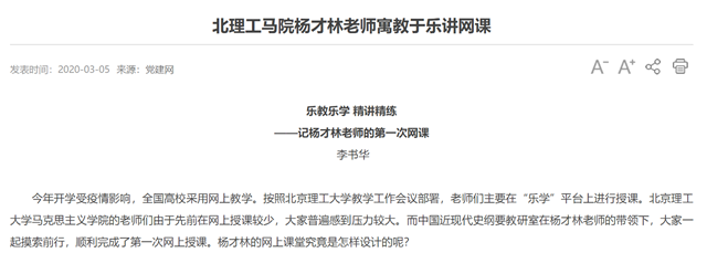 团队的力量是无穷的。杨才林发动教研室同事和他的助教小团队,集思广益、同频共振,多次围绕网络教学各种潜在问题,深入讨论、制定详案。为此,他提出一个口号:“乐教乐学 精讲精练”,并且总结了“纲要网络教学三题”,即教师怎么设计——助教怎么做——学生怎么学。