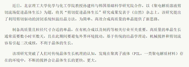该项研究突破了人们对传统晶体生长机理的认知,发现在聚离子液体(PIL,一类聚电解质材料)存在的环境中,不断的搅拌会让晶体生长的更快、更大。