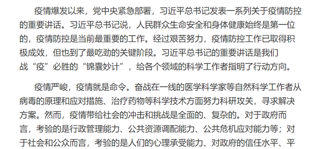 疫情爆发以来,党中央紧急部署,习近平总书记发表一系列关于疫情防控的重要讲话。习近平总书记说,人民群众生命安全和身体健康始终是第一位的,疫情防控是当前最重要的工作。经过艰苦努力,疫情防控工作已取得积极成效,但也到了最吃劲的关键阶段。习近平总书记的重要讲话是我们战“疫”必胜的“锦囊妙计”,给各个领域的科学工作者指明了行动方向。