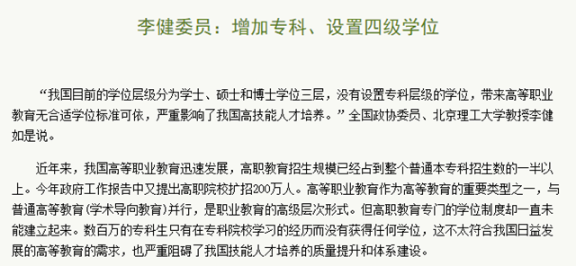 李健委员:增加专科、设置四级学位
