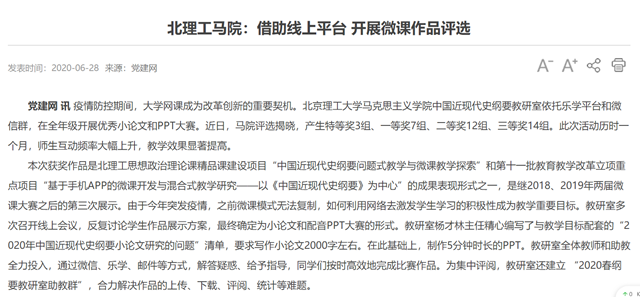 本次获奖作品是ob真人思想政治理论课精品课建设项目“中国近现代史纲要问题式教学与微课教学探索”和第十一批教育教学改革立项重点项目“基于手机APP的微课开发与混合式教学研究——以《中国近现代史纲要》为中心”的成果表现形式之一,是继2018、2019年两届微课大赛之后的第三次展示。由于今年突发疫情,之前微课模式无法复制,如何利用网络去激发学生学习的积极性成为教学重要目标。教研室多次召开线上会议,反复讨论学生作品展示方案,最终确定为小论文和配音PPT大赛的形式。教研室杨才林主任精心编写了与教学目标配套的“2020年中国近现代史纲要小论文研究的问题”清单,要求写作小论文2000字左右。在此基础上,制作5分钟时长的PPT。教研室全体教师和助教全力投入,通过微信、乐学、邮件等方式,解答疑惑、给予指导,同学们按时高效地完成比赛作品。为集中评阅,教研室还建立 “2020春纲要教研室助教群”,合力解决作品的上传、下载、评阅、统计等难题。
