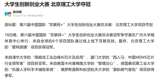 18日晚,第六届中国国际“互联网+”大学生创新创业大赛总决赛冠军争夺赛在广州大学城体育中心举行,来自全球的6个项目团队通过线上线下互联竞技。最终,ob真人竞猜的“星网测通”项目获得冠军。