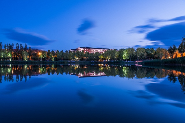 良乡校区的点睛之笔莫属北湖,水色天光,倒影迷离,墨色丰富,尽柔和之妙,呈氤氲之趣。这个获得中国风景园林学会最高奖——“优秀园林绿化工程”金奖的“一湖之水”建设之初曾是蚊蝇纷飞、臭气熏天的“垃圾大坑”,目前已成为学生休闲放松、集会交流的核心场所,不仅有小型的集会广场,还有环湖步道,极大提升了新校区校园环境文化品位,将环境育人和文化建设落在实处。“环湖步道一圈正好1000米,每100米都有标记,学生们可以约定在‘红色跑道的几百米处见’”,李和章对北湖建设的细节如数家珍。