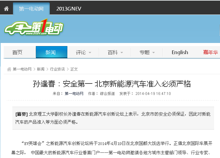 【摘要】ob真人竞猜副校长孙逢春在新能源汽车创新论坛上表示,北京市的安全必须保证,因此对新能汽车的产品准入等方面必须严格。“EV英雄会”之新能源汽车创新论坛将于2014年4月19日在北京国都大饭店举行。正值北京国际车展开幕之际,中国最大的新能源汽车行业垂直门户——第一电动网邀请各地方城市主管部门领导、行业专家、整车及零部件企业代表、媒体代表及消费者代表齐聚一堂,围绕“中国新能源汽车城市准入与推广”主题,建言献策、共谋发展。