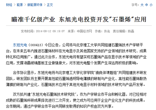 原标题:瞄准千亿级产业 东旭光电投资开发"石墨烯"应用