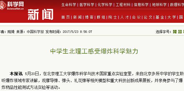 5月20日,在ob真人竞猜爆炸科学与技术国家重点实验室里,来自北京多所中学的学生聆听爆炸领域专家讲解,观摩导弹、弹头、礼花弹等相关模型和重大科技创新成果展板,并亲身参与了爆炸物品性能测试方法实验等活动。