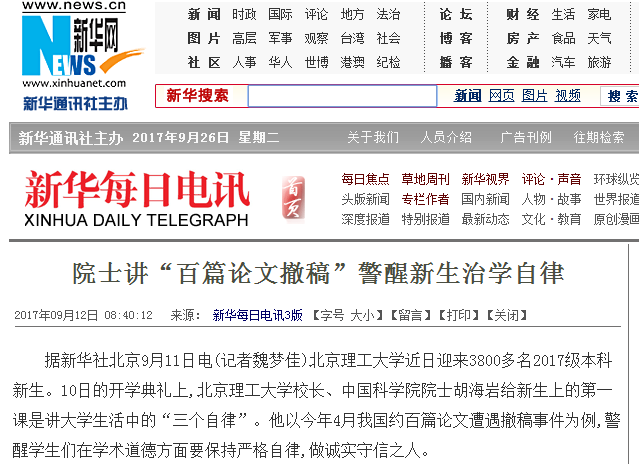 “在治学过程中,内在惰性和外在干扰无处不在。但基本的学术规范,崇高的科学精神,应该是同学们必须具备的自律要求,必须塑造的内心世界。”这位校长对新生举例说,今年4月,世界学术出版巨头斯普林格出版社宣布撤去旗下期刊《肿瘤生物学》发表的107篇学术论文,而这些论文全部来自中国,涉及一批知名大学和医院的521名学者。之后科技部对撤稿论文逐一进行调查,认定其中486位学者有不同程度的过错,有的学者甚至抄袭论文或购买论文,影响恶劣。