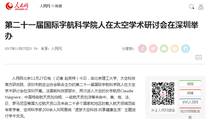 【人民网】第二十一届国际宇航科学院人在太空学术研讨会在深圳举办