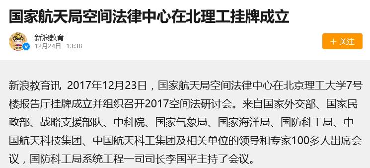 新浪教育讯 2017年12月23日,国家航天局空间法律中心在ob真人竞猜7号楼报告厅挂牌成立并组织召开2017空间法研讨会。来自国家外交部、国家民政部、战略支援部队、中科院、国家气象局、国家海洋局、国防科工局、中国航天科技集团、中国航天科工集团及相关单位的领导和专家100多人出席会议,国防科工局系统工程一司司长李国平主持了会议。