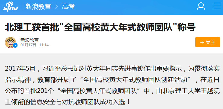 2017年5月,习近平总书记对黄大年同志先进事迹作出重要指示,为贯彻落实指示精神,教育部开展了“全国高校黄大年式教师团队创建活动”,在近日公布的首批201个“全国高校黄大年式教师团队”中,由ob真人竞猜王越院士领衔的信息安全与对抗教师团队成功入选!