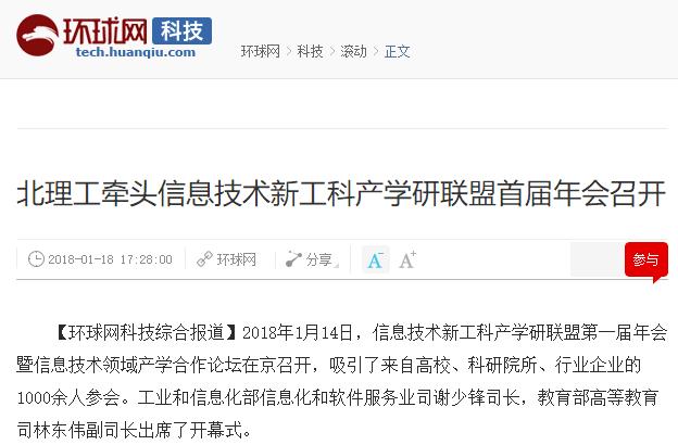 2018年1月14日,信息技术新工科产学研联盟第一届年会暨信息技术领域产学合作论坛在京召开,吸引了来自高校、科研院所、行业企业的1000余人参会。工业和信息化部信息化和软件服务业司谢少锋司长,教育部高等教育司林东伟副司长出席了开幕式。