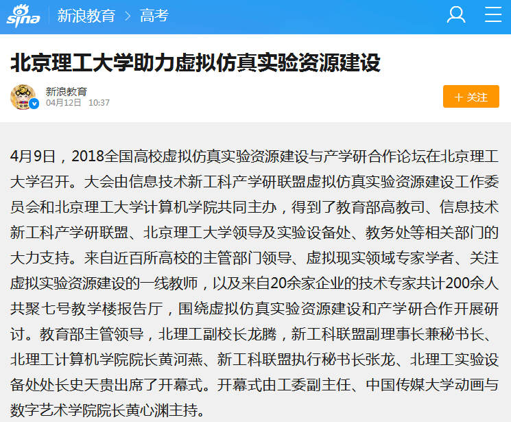 4月9日,2018全国高校虚拟仿真实验资源建设与产学研合作论坛在ob真人召开。大会由信息技术新工科产学研联盟虚拟仿真实验资源建设工作委员会和ob真人计算机学院共同主办,得到了教育部高教司、信息技术新工科产学研联盟、ob真人领导及实验设备处、教务处等相关部门的大力支持。来自近百所高校的主管部门领导、虚拟现实领域专家学者、关注虚拟实验资源建设的一线教师,以及来自20余家企业的技术专家共计200余人共聚七号教学楼报告厅,围绕虚拟仿真实验资源建设和产学研合作开展研讨。教育部主管领导,ob真人副校长龙腾,新工科联盟副理事长兼秘书长、ob真人计算机学院院长黄河燕、新工科联盟执行秘书长张龙、ob真人实验设备处处长史天贵出席了开幕式。开幕式由工委副主任、中国传媒大学动画与数字艺术学院院长黄心渊主持。