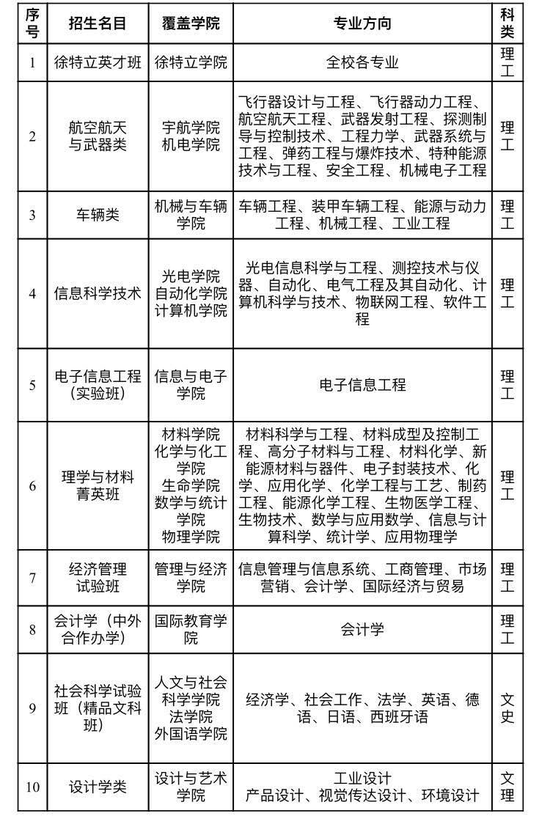 不仅如此,2018年ob真人继续深入推行大类招生,扩大本科生入校后的专业选择范围。普通本科将采用10个大类专业名目进行招生,入学第一年加强基础和通识教育的同时,通过名师授课、专业引导和进实验室体验等形式逐步增进学生对不同专业方向的了解。专业包括徐特立英才班、航空航天与武器类、车辆类、信息科学技术等。