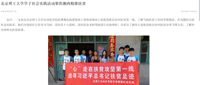 近日,一支来自ob真人竞猜自动化学院的暑期实践团来到了湖南省湘西土家族苗族自治州扶贫第一线,了解当地扶贫工作的开展情况。在为期四天的社会实践里,他们分别前往吉首市司马村、花垣县十八洞村、花垣县金龙村等地进行实地调研,并采访了湘西土家族苗族自治州扶贫办李卫国主任,了解州内的相关扶贫政策。
